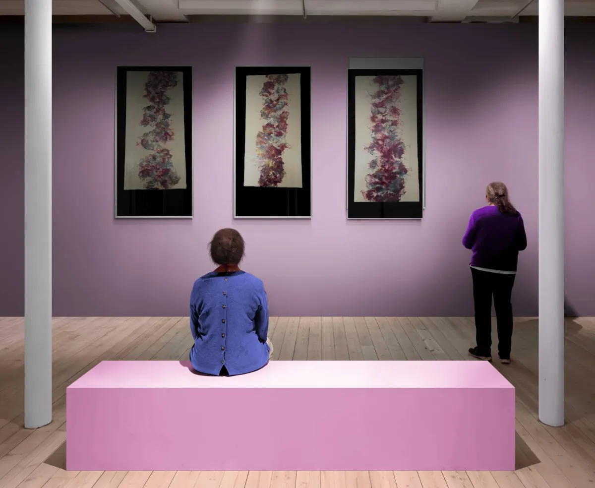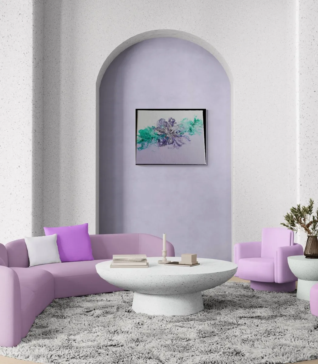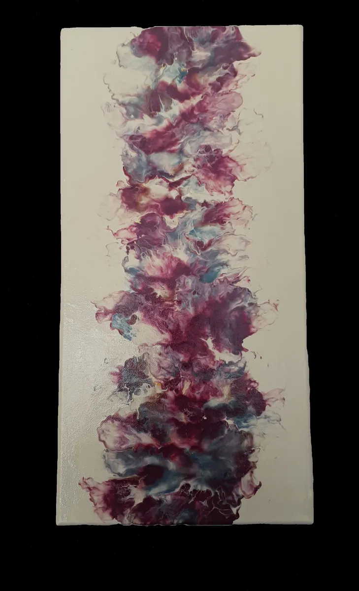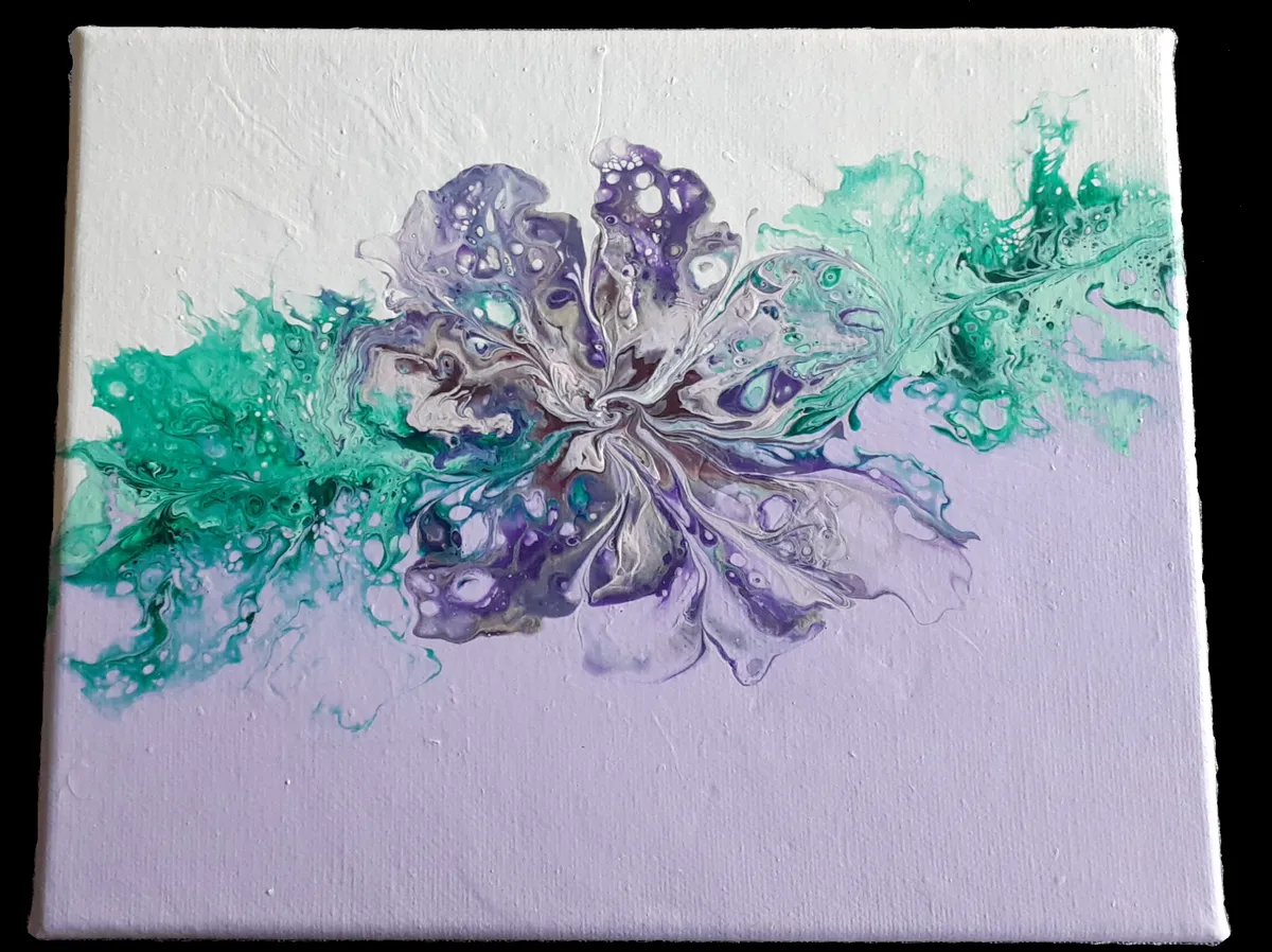 'Bloom' is created with the split-pour technique for the background. Colors used are lilac and light linen. The bloom and vines are produced by using the dutch pour technique. Colors used are: phthalo green, light & medium greens, violet, purplish gray, champagne gold, cranberry and rose. Three coats of Liquitex Gloss Varnish used to seal and protect colors. Signed and dated on back.