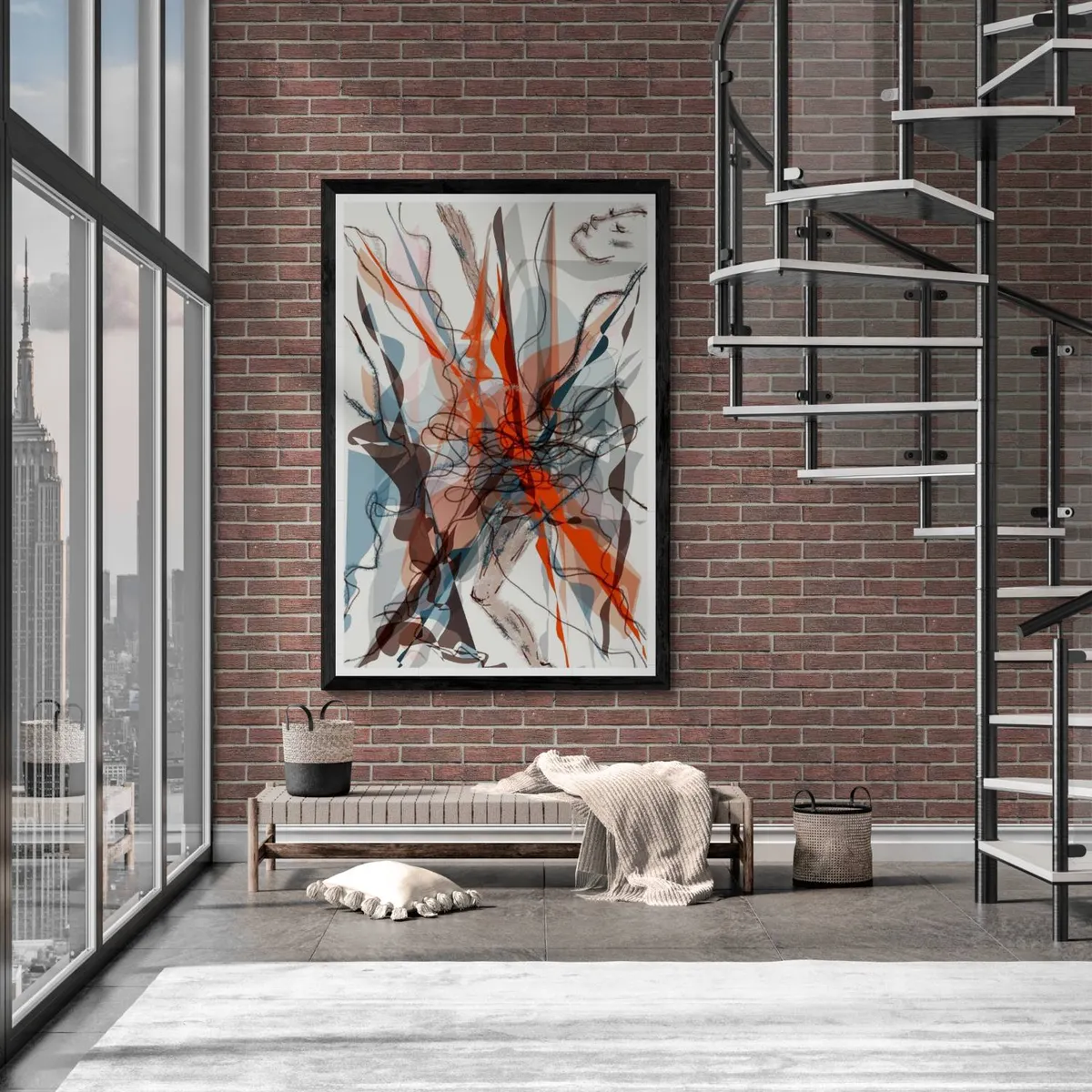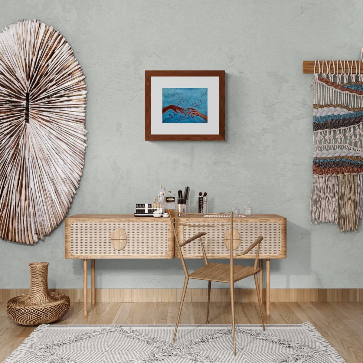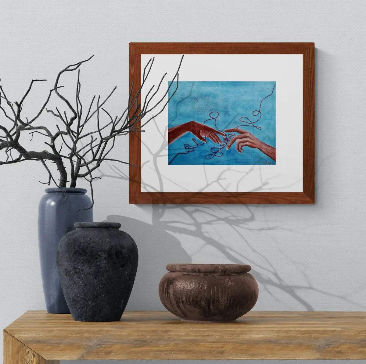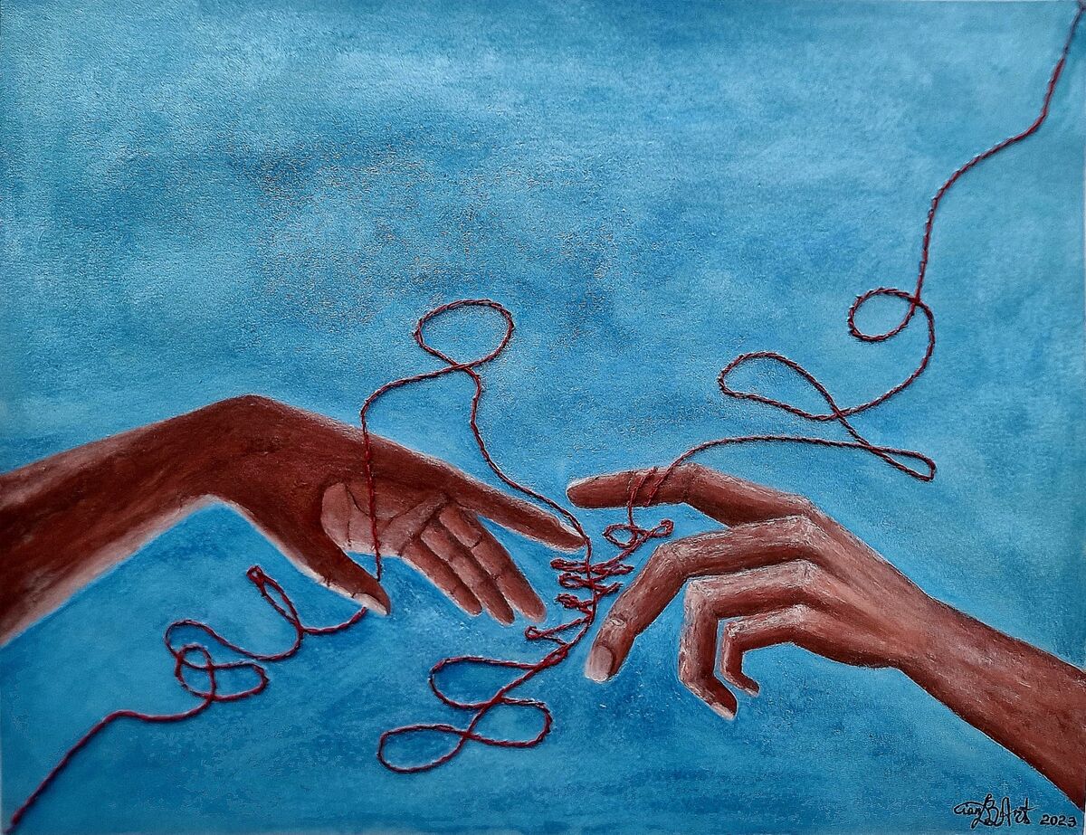 I chose to work with a watercolour combo of blue, light brown, and white for my painting. I added an embroidery detail using cotton red thread. I worked on 250 gsm paper, acid free and used glitter solid watercolour, tempera and cotton thread for the embroidery.